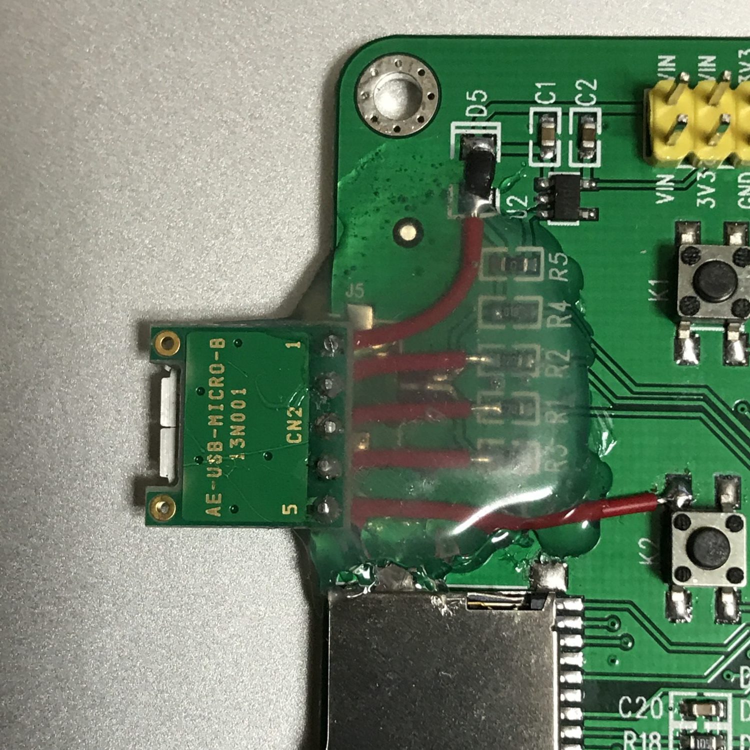 こちで 紹介した個人的にGreen Boardと呼ぶmicropython用ボードのUSBコネクタの補修をした。
